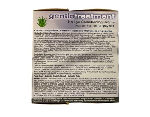 • Gentle Treatment Relaxer for grey No-Lye, experience natural and improved conditioning with Gentle-Treatment No-Lye conditioning Relaxer, now with pure Aloe Vera Gel. Included in the relaxer creme is our naturally derived pure Aloe Vera Gel. The brilliant chemists at Johnson products have succeeded in actually improving the first patented Relaxer. Complete with two substantive conditioning agents that work to protect your hair from damage, dryness and dullness. Conditions and relaxes your hair in one easy, convenient step.
